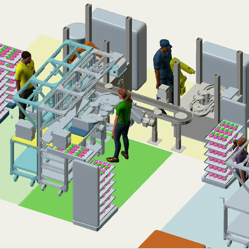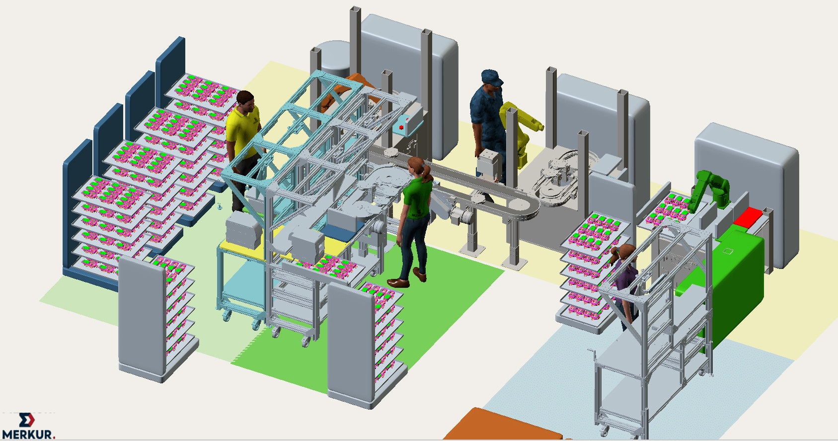 Merkur est en mesure de simuler des îlots de production optimaux et performants grâce à notre outil FlexSim®. Le flux et les opérations sont optimisés afin de rencontrer les objectifs d’espace et de temps de cycle de notre client.
