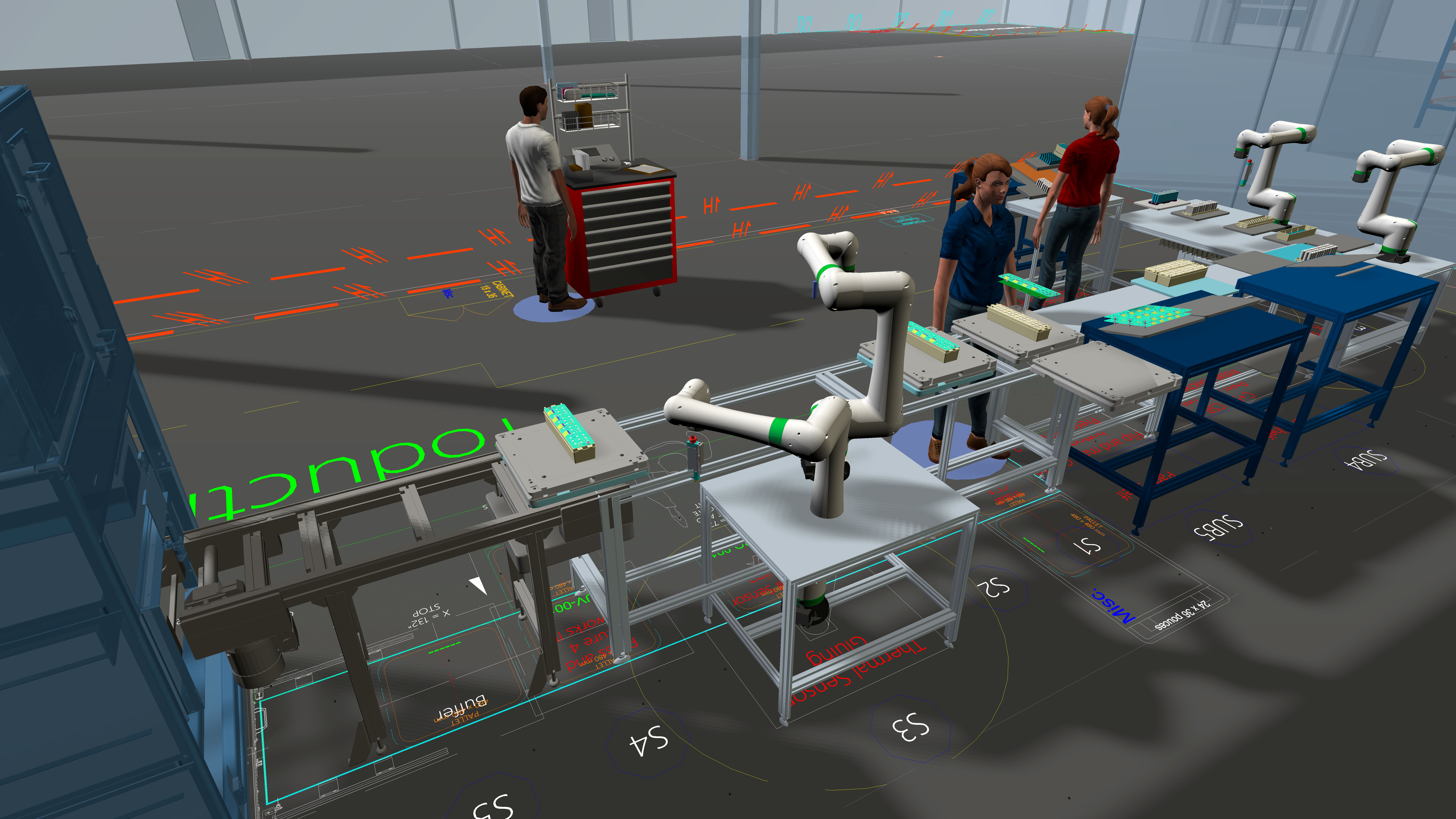 - Visually simulate the layout of work cells, assembly stations, and entire plants